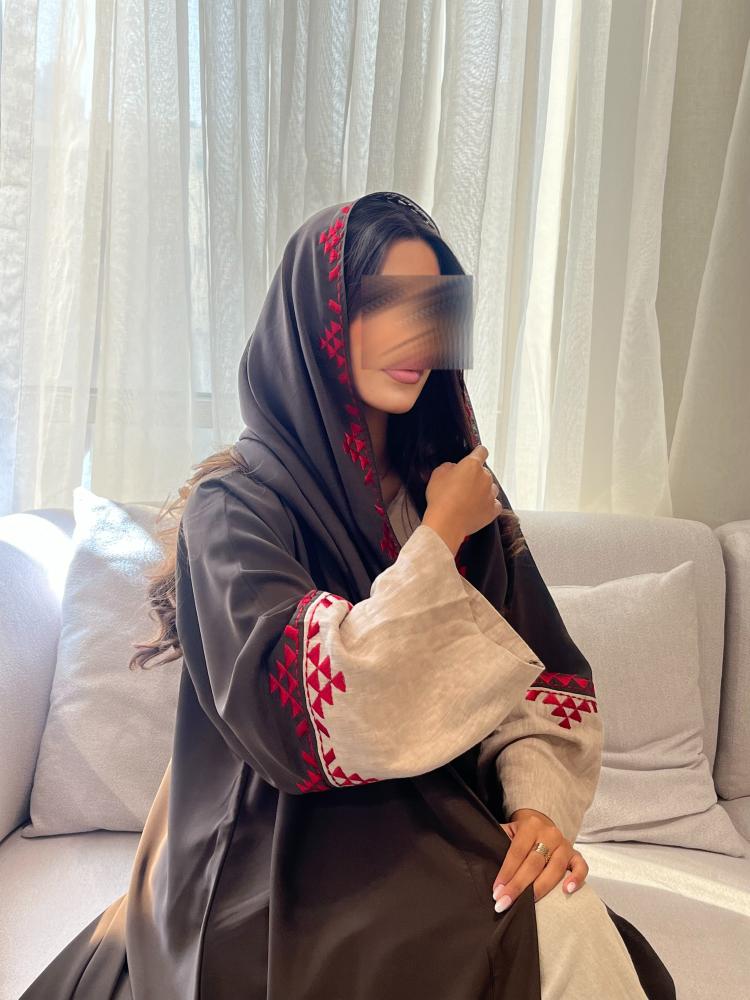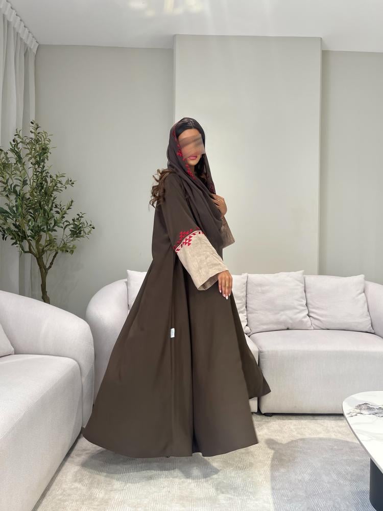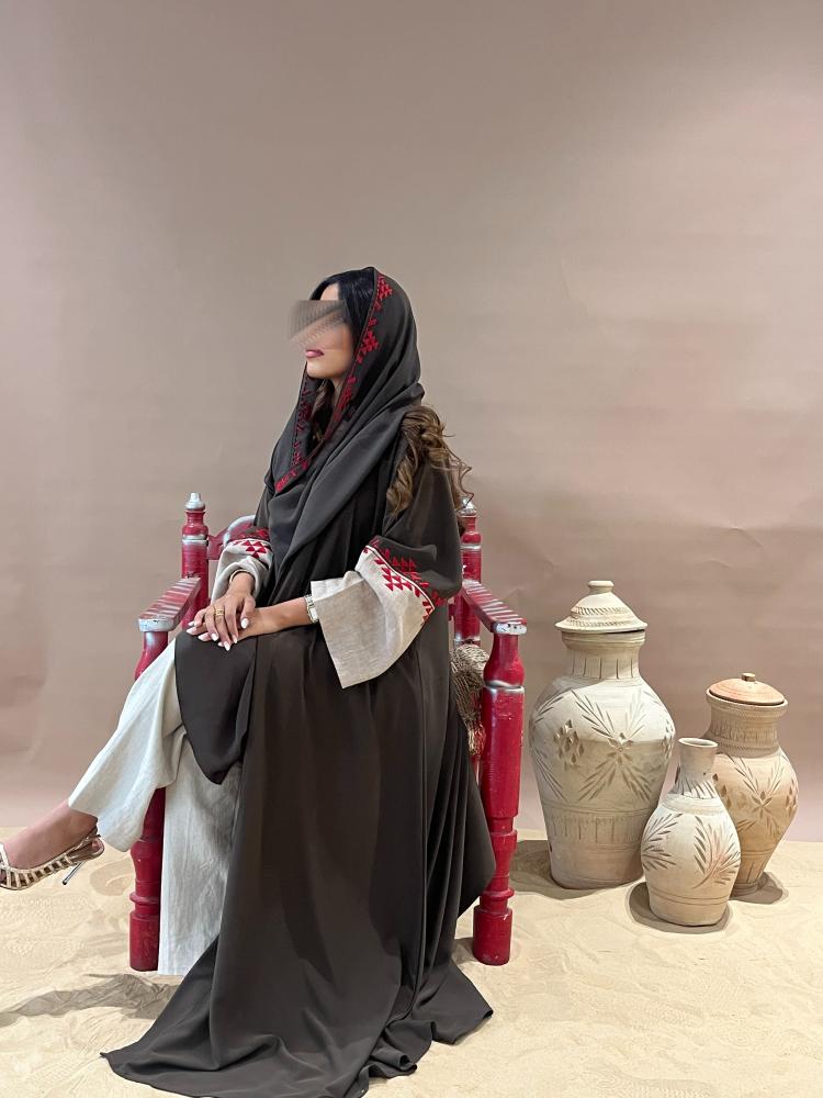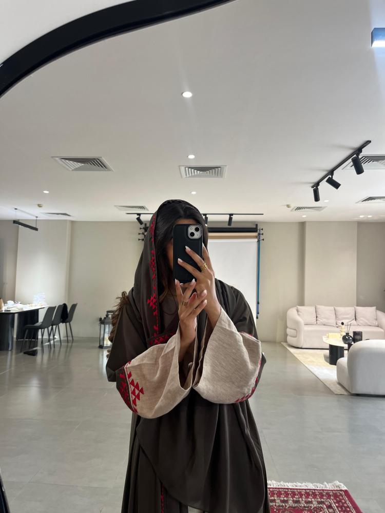 عبايـة تجمع بين التراث والحاضـر ❣️ ، نعتز فيها بهويتنا السابقة من خلال النقوش الحمراء المعروفة للزينة في الازياء والاثاث سابقاً مدموجة مع أقمشة والوان حديثة 🪡